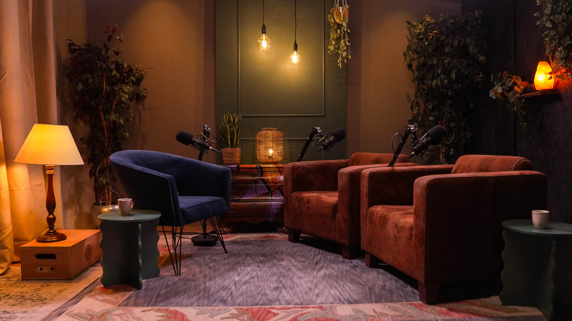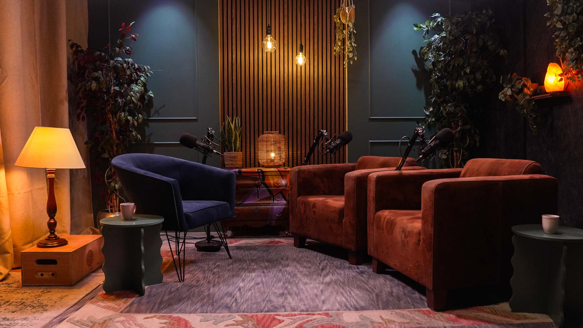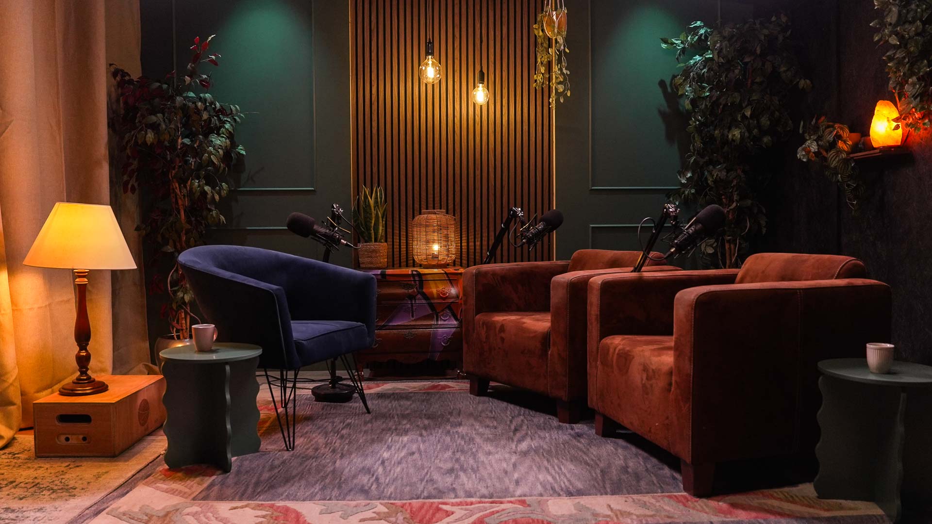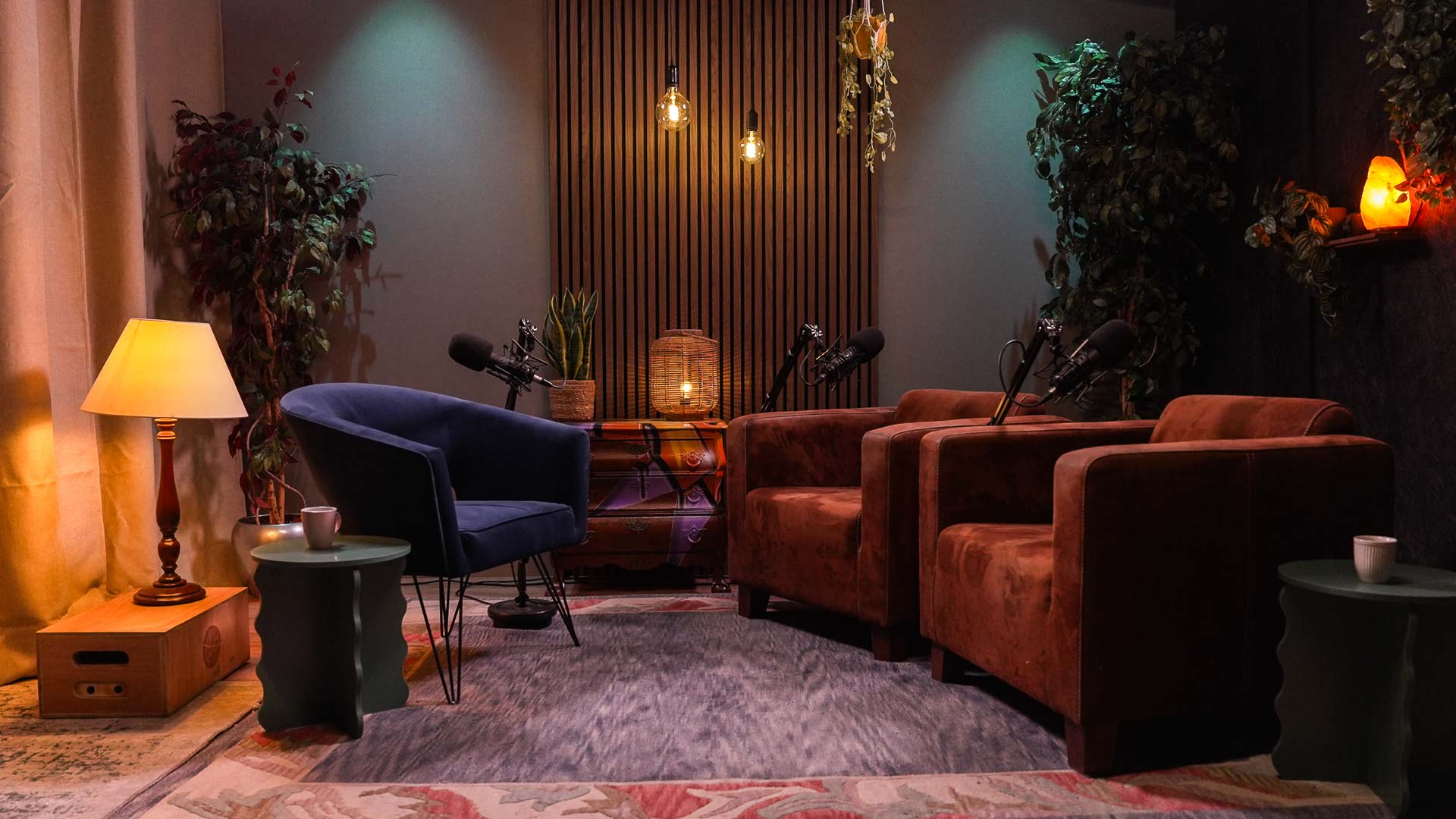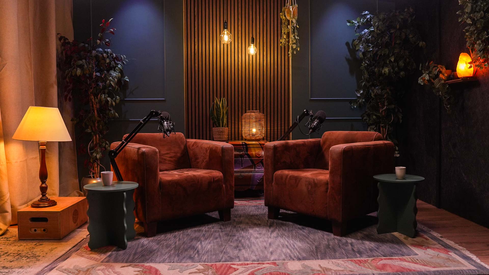 Een warme, klassieke setting met moderne details. Houtaccenten en sfeerverlichting creëren een intieme en ontspannen podcastsfeer.