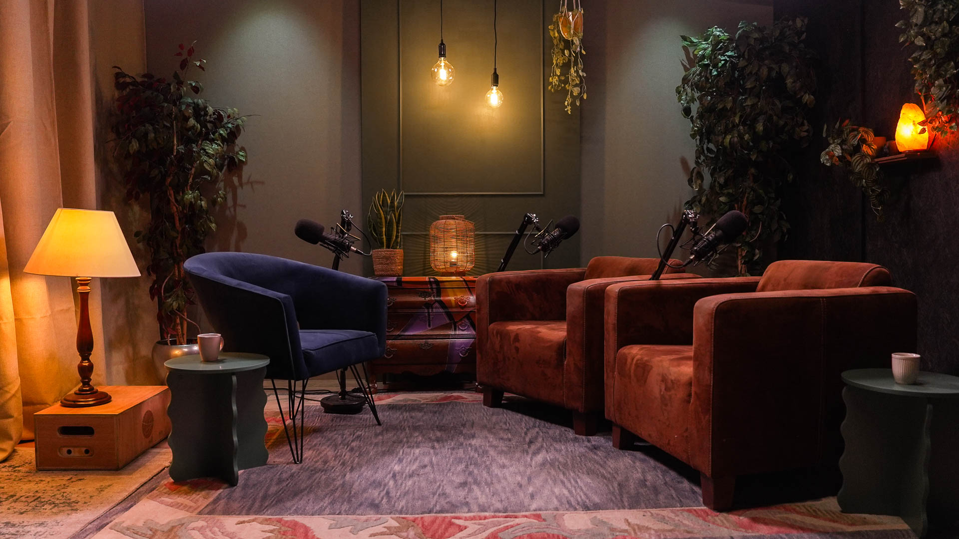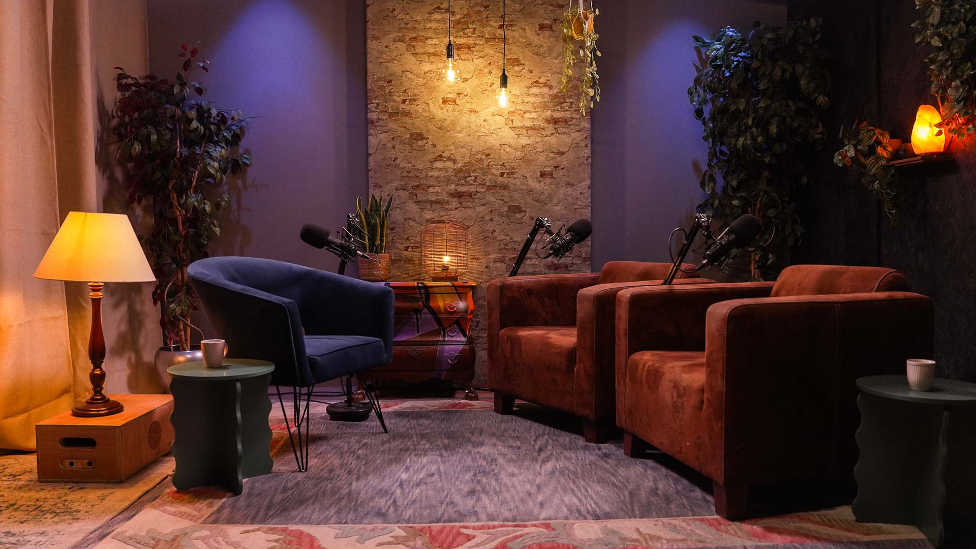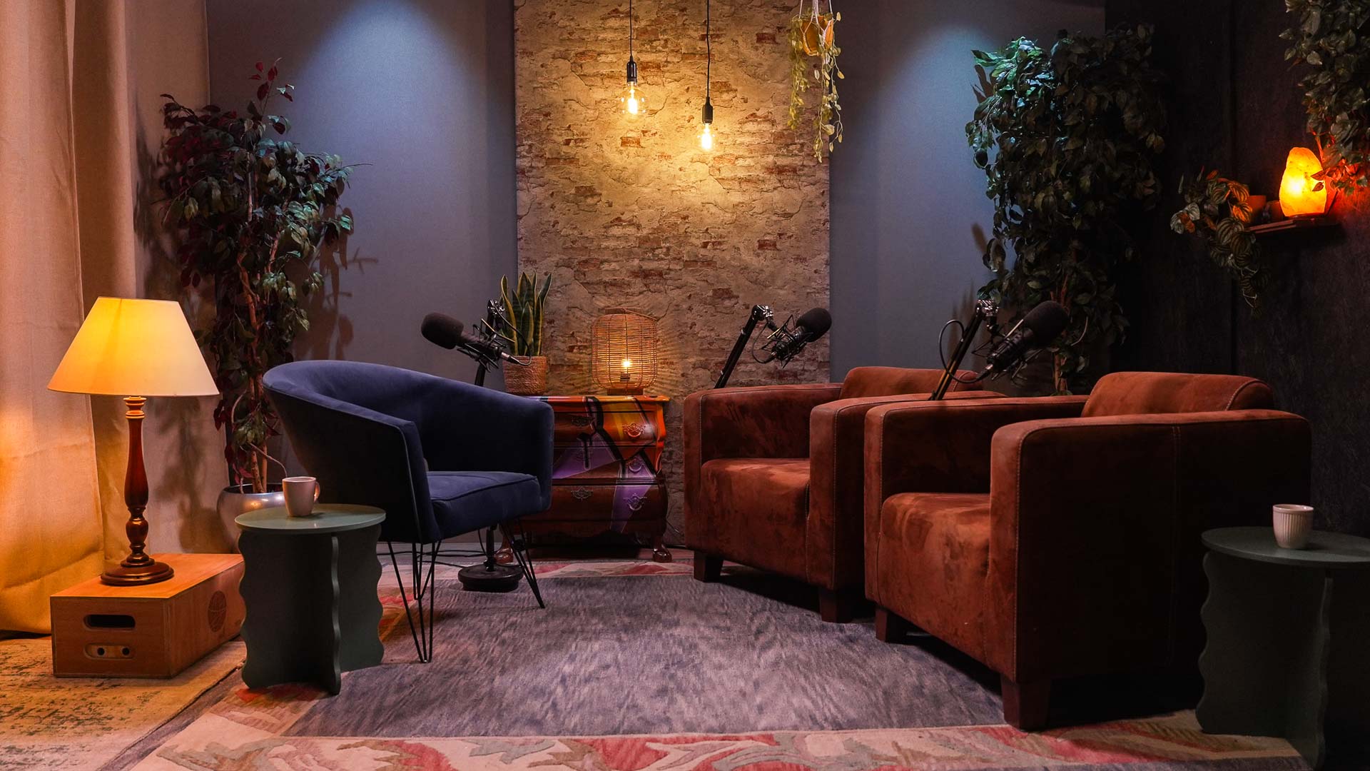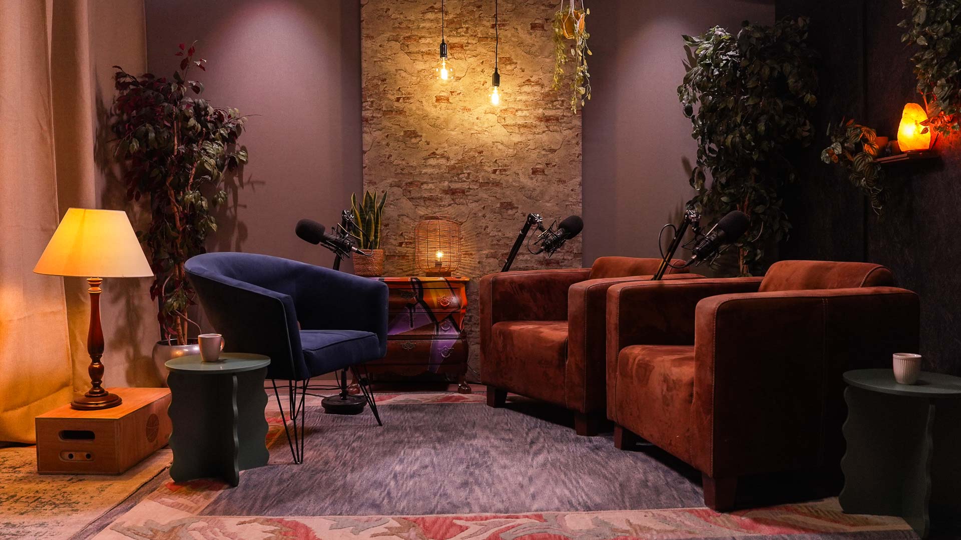 Kies de achtergrond die past bij jouw verhaal. Ga voor modern en strak, zacht en klassiek of juist robuust en karaktervol. Elke setting is met zorg ingericht en aangekleed met sfeervolle verlichting en comfortabele zitplekken. Onze podcaststudio is volledig voorbereid, zodat jij je kunt focussen op het gesprek.